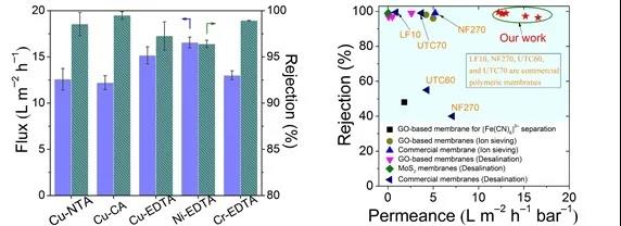 針對上述問題,張煒銘、潘丙才教授課題組借鑒納米仿生思路,首次提出通過軟物質(zhì)插層劑構(gòu)建類似水通道蛋白通道的新策略。研究以實現(xiàn)污廢水中重金屬絡(luò)合物的高效分離與水質(zhì)凈化為最終目標,首先制備出聚丙烯腈凝膠軟粒子(PAN GPs,1-8nm)作為氧化石墨烯(GO)膜的納米級插層劑,通過控制GO膜層間PAN GPs形變、溶脹以及PAN GPs-π作用實現(xiàn)了亞納米尺度的層間距離精確調(diào)控,與此同時GO膜規(guī)整的層狀結(jié)構(gòu)得以充分保留。此外,通過堿性處理可在PAN GPs表面產(chǎn)生電荷和雙疏水/親水性,有機融合了水通道截留性與水的快速滲透,成功構(gòu)建出類似水通道/蛋白通道結(jié)構(gòu)。研究結(jié)果表明,該GO復合膜可截留96%以上的重金屬絡(luò)合離子(Cu-NTA、Cu-CA、Cu-EDTA、Ni-EDTA、Cr-EDTA),水通量是文獻報道同類膜的4-13倍。這一研究深入探究了納米級軟顆粒插層劑與氧化石墨烯薄片之間的相互作用及其高水通和高截留的限域分離構(gòu)效機制,提出的軟顆粒插層策略有望成為設(shè)計和研制高性能水處理二維復合膜的新方向。